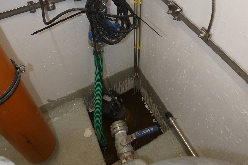 - Einbau einer konduktiven Fünfstabsonde zur Erfassung einer Überflutung im Maschinenraum und zur Steuerung der Entwässerungspumpe