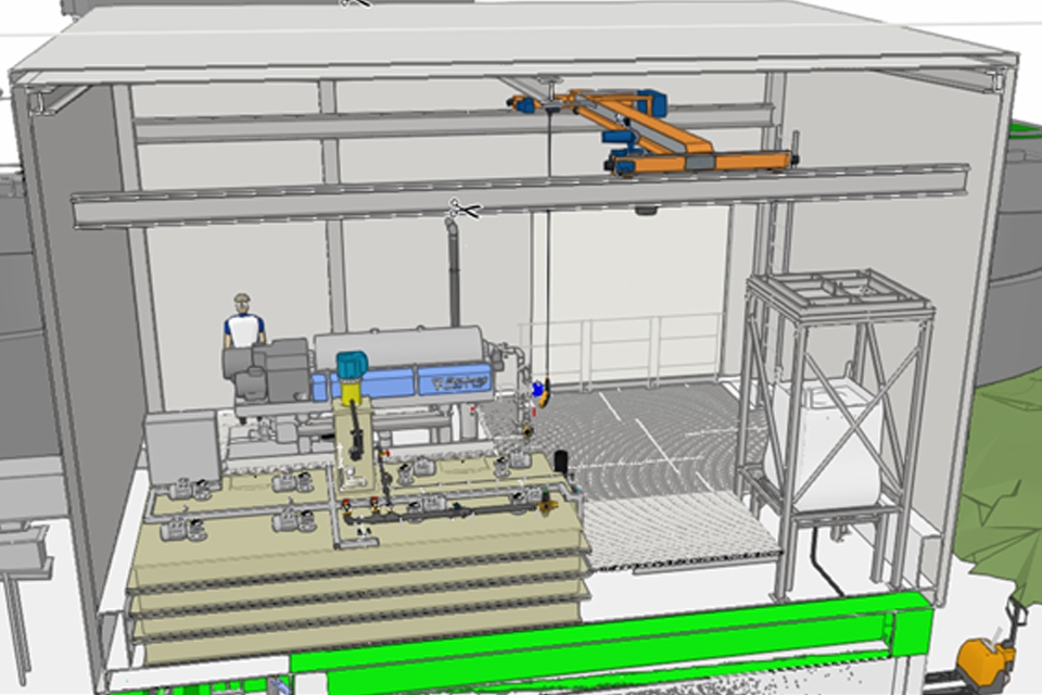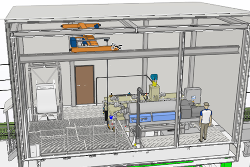- Neuaufbau der Beschickungspumpe, Zentratwasserpumpe, Mazerators, Rohrleitungen und zugehörigen Armaturen für die Zentrifuge und sonstigen Verfahrenswege. Diese Komponenten und die entsprechenden Absperrarmaturen werden mit der SPS der Schlammentwässerung verbunden,